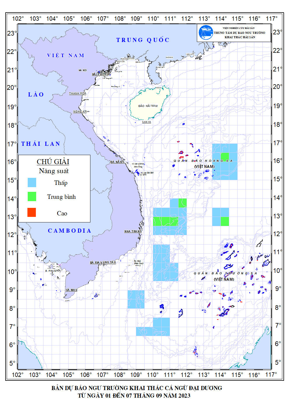 Trang nhất/ Dự báo khai thác theo nghề Dự báo nghề câu cá ngừ đại dương từ 01-07/9/2023 Mùa vụ: Vụ Nam () | Năm dự báo: 2023 | Tháng dự báo: 09/2023 Nghề: Câu cá ngừ đại dương Cơ quan dự báo: Trung tâm Dự báo ngư trường Khai thác hải sản